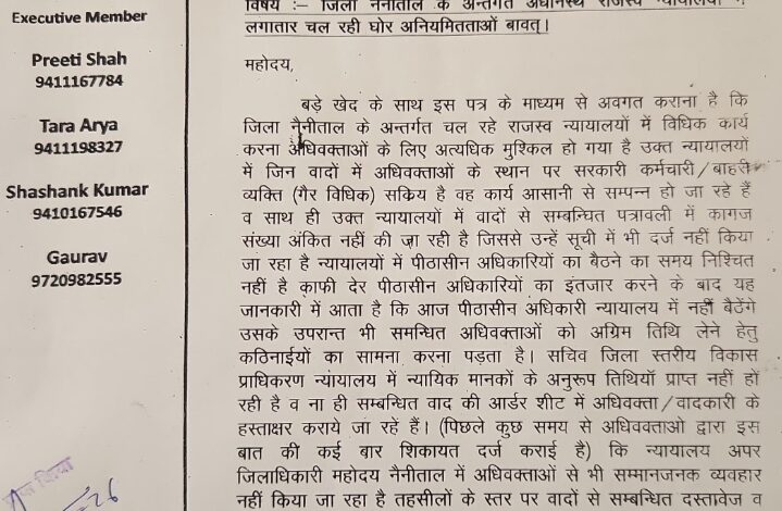 नैनीताल l राजस्व न्यायालयों में व्याप्त गंभीर अनियमितताओं और कार्यप्रणाली से नाराज अधिवक्ताओं ने आंदोलन का ऐलान किया है अधिवक्ताओं में राजस्व न्यायालयों की कार्यशैली को लेकर गहरा रोष है इस संबंध में अधिवक्ताओं द्वारा जिलाधिकारी को पत्र भेजकर अपनी समस्याओं और आपत्तियों से अवगत कराया है पत्र में आरोप लगाया गया है कि राजस्व न्यायालयों में बाहरी व्यक्तियों की सक्रिय भूमिका बनी हुई है जिससे न्यायिक प्रक्रिया प्रभावित हो रही है वहीं पीठासीन अधिकारी समय पर न्यायालय में उपस्थित नहीं हो रहे जिससे वादकारियों और अधिवक्ताओं को अनावश्यक परेशानियों का सामना करना पड़ रहा है अधिवक्ताओं का कहना है कि जिला विकास प्राधिकरण में मामलों की सुनवाई के लिए मानकों के अनुरूप तिथियां निर्धारित नहीं की जा रही हैं साथ ही ऑर्डर शीट में न तो अधिवक्ताओं और न ही वादकारियों के हस्ताक्षर कराए जा रहे हैं जो न्यायिक नियमों का खुला उल्लंघन है पत्र में एडीएम के व्यवहार पर भी कड़ी आपत्ति जताई गई है और कहा गया है कि अधिवक्ताओं के साथ लगातार अमर्यादित एवं अनुचित व्यवहार किया जा रहा है जो किसी भी स्थिति में स्वीकार्य नहीं है वहीं राजस्व वादों में सम्मन तामिली की रिपोर्ट समय से दाखिल नहीं होने के कारण मामलों के निस्तारण में अनावश्यक विलंब हो रहा है अधिवक्ताओं का यह भी कहना है कि वादों से संबंधित सामान्य जानकारी प्राप्त करने के लिए भी उन्हें संघर्ष करना पड़ रहा है इन सभी समस्याओं से जिला प्रशासन को पूर्व में भी अवगत कराया जा चुका है लेकिन इसके बावजूद राजस्व न्यायालयों प्राधिकरण और संबंधित अधिकारियों की कार्यप्रणाली में कोई सुधार नहीं हुआ है लगातार अनदेखी से आक्रोशित अधिवक्ताओं ने स्पष्ट किया है कि वे आंदोलन के लिए बाध्य हैं और 27 जनवरी को जिलाधिकारी कार्यालय में धरना प्रदर्शन किया जाएगा।