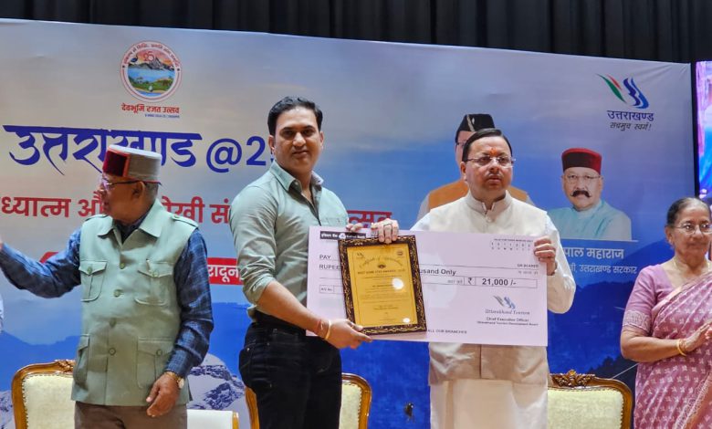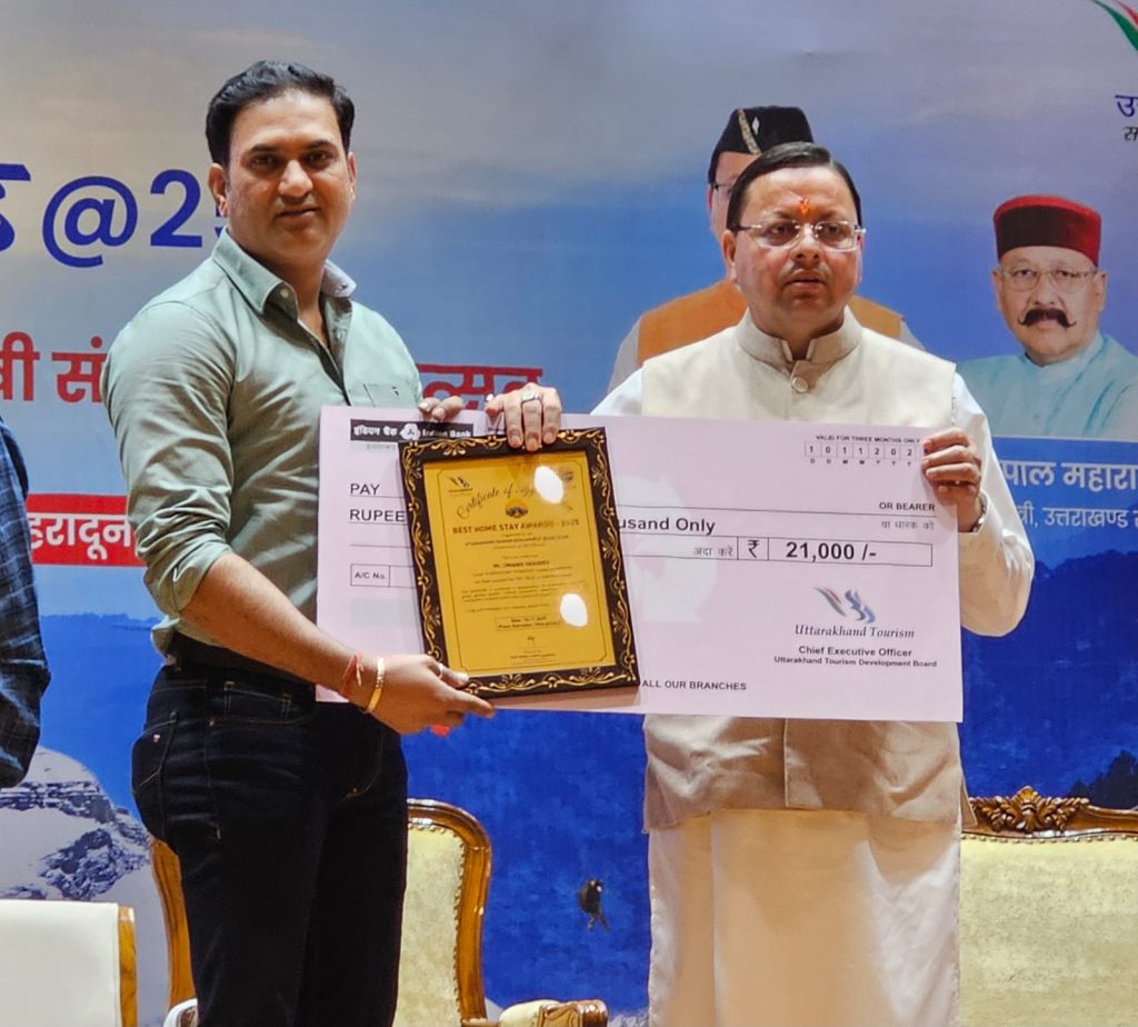 नैनीताल l उत्तराखंड राज्य के स्थापना दिवस पर रजत जयंती महोत्सव पर पर्यटन विभाग द्वारा देहरादून में आयोजित कार्यक्रम में जंगलिया गांव (भीमताल) नैनीताल स्थित अरुणोदय होम स्टे को उत्तराखंड में सर्वोच्च स्थान मिलने पर माननीय मुख्यमंत्री पुष्कर सिंह धामी द्वारा अरुणोदय के संचालक उमंग वासुदेवा को सम्मानित किया गया । मुख्यमंत्री द्वारा श्री वासुदेव को मोमेंट ओ एवं 21000 रुपए का चेक देकर सम्मानित किया गया । पर्यटन को बढ़ावा देने के लिए निरंतर होमस्टे के कार्य प्रगति पर है व पर्यटक विभाग द्वारा जिला स्तर पर होमस्टे का चयन किया गया, जिसमें अरुणोदय होमस्टे को सर्वोच्च स्थान प्राप्त हुआ ।