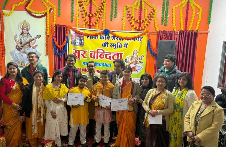 नैनीताल l बसंत पंचमी के शुभ अवसर पर लोक कवि शेरदा “अनपढ़” जी की स्मृति में मां पूर्णागिरी मंदिर प्रांगण श्याम विहार हल्द्वानी पर शेरदा अनपढ़ कला एवं साहित्य द्वारा सुर वंदिता भजन प्रतियोगिता का आयोजन किया गया। प्रतियोगिता में श्री साकेत अग्रवाल, डॉ राखी पंत डॉ अतुल सक्सेना श्री बृजमोहन जोशी जी अन्य सम्मानित अतिथियों द्वारा मां सरस्वती का सामूहिक श्लोक पाठ कर पूजा अर्चना व माल्यार्पण व दीप प्रज्वलित कर प्रतियोगिता का शुभारंभ किया।