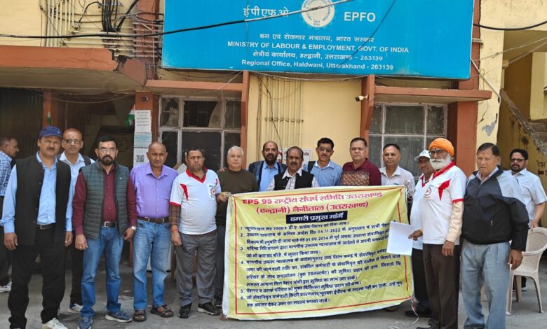 ई पी एस 95 राष्ट्रीय संघर्ष समिति जनपद कार्यकारिणी हल्द्वानी के जिला अध्यक्ष राजेंद्र कुमार बलिया के नेतृत्व में कर्मचारियों ने सेवानिवृत्त कर्मचारियों की प्रमुख मांग7500 एवं महंगाई भत्ता व चिकित्सा सुविधा संबंधी मांग पत्र उप जिलाधिकारी प्रमोद कुमार को पौधे के साथ ज्ञापन दिया। प्रमोद कुमार ने कहा कि वह इस मांग पत्र को माननीय प्रधानमंत्री को प्रेषित करेंगे। उसके बाद ईपीएफओ कार्यालय में भविष्य निधि आयुक्त सिद्धार्थ सिंह को पौधे के साथ ज्ञापन दिया। भविष्य निधि आयुक्त ने कहा कि वह भी उनके मांग पत्र को प्रधानमंत्री को प्रेषित करेंगे ।इसी क्रम में भविष्य निधि कार्यालय व उप जिलाधिकारी कार्यालय में सेवानिवृत्ति कर्मचारियों ने प्रदर्शन किया। इसी क्रम में ईपीएस 95 संघर्ष समिति के प्रदेश अध्यक्ष भूपेंद्र सिंह अधिकारी ने कहा कि उनका संघर्ष जारी रहेगा।