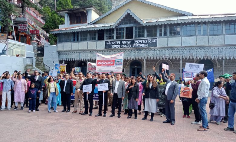 नैनीताल l उत्तराखण्ड राज्य विधिक सेवा प्राधिकरण, नैनीताल के दिशा निर्देशानुसार एवं प्रभारी अध्यक्ष जिला विधिक सेवा प्राधिकरण, नैनीताल / प्रथम अपर जिला न्यायाधीश श संजीव कुमार की अध्यक्षता में सिविल जज (सी०डि०) / सचिव, जिला विधिक सेवा प्राधिकरण, नैनीताल पारुल थपलियाल के द्वारा रविवार को जिला मुख्यालय नैनीताल के दिवानी न्यायालय परिसर (शिविल कोर्ट कैम्पस ) से नशीली दवाओं के खिलाफ अभियान के तहत विधिक साक्षरता एवं जागरुकता रैली का आयोजन किया गया। जागरूकता रैली का शुभारंभ प्रथम अपर जिला न्यायाधीश संजीव कुमार द्वारा हरी झंडी दिखाकर किया गया।