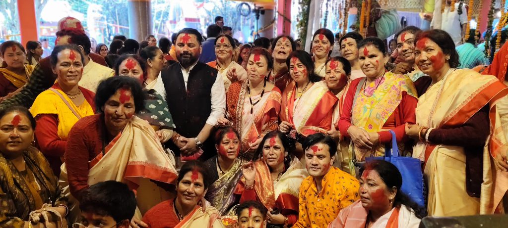 नैनीताल। सर्बजनिन दुर्गा पूजा कमेटी के तत्वावधान में आयोजित नव दुर्गा महोत्सव में दशमी के दिन विधिवत धार्मिक अनुष्ठान संपन्न हुए जिसके बाद मां दुर्गा का डोला नयना देवी मंदिर से नगर भ्रमण के लिए निकाला गया। गुरुवार कि सुबह मुख्य पुजारी शुभ चक्रवर्ती ने प्रातः महादशमी पूजन किया। जिसके बाद दर्पण विर्सजन और देवी वरण अनुष्ठान हुए। जिसके बाद डोला नगर भ्रमण के लिए निकला। मां का डोला मुख्य बाजार से माल रोड होता हुआ तल्लीताल पहुंचेगा जहां वैष्णो मंदिर से तल्लीताल बाजार होते हुए ठंडी सड़क पर मूर्ति विसर्जन किया जाएगा। डोला भ्रमण के दौरान हजारों की तादात में भक्त मौजूद रहे। साथ ही भजन मंडली व छोलिया नृतको ने बेहतरीन नृत्य प्रस्तुत किया और स्कूली बच्चों की झांकियां भी आकर्षण का केंद्र रही। भ्रमण के दौरान बाजारों में लोगों ने घरों से अक्षत व फूल बरसाकर दुर्गा मां को नमन किया। महोत्सव में बंगाली और कुमाऊनी संस्कृति का समागम देखने को मिला। इस दौरान अध्यक्ष बहादुर सिंह बिष्ट, वरिष्ठ उपाध्यक्ष त्रिभुवन फर्त्याल, महासचिव उमेश मिश्रा, कोषाध्यक्ष राकेश कुमार, भास्कर बिष्ट, प्रेम कुमार शर्मा, चंदन कुमार दास, विशाल वर्मा ,आशीष वर्मा नवीन शर्मा ,तृप्ती मजूमदार,डॉली भट्टाचार्या,कमलेश शर्मा , मिथाली रॉय, सुना जयसिंघानी, मोमिता मजूमदार, कुमकुम शर्मा,सहित अन्य लोग मौजूद रहे।