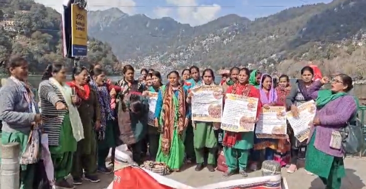 नैनीताल। भोजनमाता संगठन उत्तराखण्ड नैनीताल इकाई ने सोमवार को तल्लीताल डांठ में जमकर नारेवाजी कर धरना प्रदर्शन किया। इस दौरान ब्लॉक अध्यक्ष तुलसी देवी ने बताया भोजन माताएं लंबे समय से अपने न्यूनतम वेतन और स्थाई नौकरी के लिए संघर्ष कर रही है सरकार हमारी मांगों को लगातार अनसुना कर रही है। भोजनमाताएं 20 – 21 सालों से सरकारी व अर्धसरकारी विद्यालय में भोजन बनाने का काम कर रही। 100 रूपये प्रतिदिन दिया जाता है और 3 हजार रूपये महीना दिया जाता है। बताया कई भोजनमाताएँ धरने में नहीं उन्हें स्कूल प्रशासन द्वारा धमकाया गया। भोजनमाताओ की मांग है कि उन्हें न्यूनतम वेतन, पीएफ ई एसआई पेंशन, आकस्मिक अवकाश, प्रस्तुति अवकाश, भोजनमाताओं को चतुर्थ श्रेणी कर्मचारी घोषित किया जाए, निकली गई भजन माता को पुनः वापस लिया जाए। कहा की यदि माँग पूरी नहीं हुई तो सभी भोजनमाताएं में धरना प्रदर्शन कर कार्य बहिष्कार किया जाएगा।