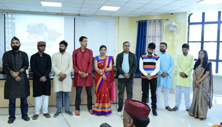 नैनीताल l ‘’उत्तराखण्ड स्थापना दिवस 09 नवम्बर 2025’’ के शुभ अवसर पर संगीत, नृत्य एवं कला प्रदर्शन विभाग, उत्तराखण्ड मुक्त विश्वविद्यालय, हल्द्वानी द्वारा सांस्कृतिक कार्यक्रम का आयोजन किया गया। कार्यक्रम की शुरुवात माननीय कुलपति महोदय प्रो0 नवीन चंद्र लोहनी, कुलसचिव डॉ खेमराज भट्ट, निदेशक मानविकी विद्याशाखा प्रो0 गिरिजा प्रसाद पांडे, प्रो0 रेनू प्रकाश, प्रो0 मंजिरी अग्रवाल, प्रो0 दिगर सिंह फर्सवाण, प्रो0 प्रो0 एम0 एम0 जोशी द्वारा सरस्वती माता के समक्ष दीप प्रज्वलन कर किया गया। इसके पाश्चात्य वंदे मातरम का गायन किया गया। वंदे मातरम गायन के पश्चात कुलसचिव महोदय डॉ खेमराज भट्ट जी द्वारा उत्तराखंड राज्य बनने के संघर्षों को सभी के समक्ष रखा। प्रो0 गिरजा प्रसाद पांडे द्वारा उत्तराखंड राज्य बनने के इतिहास को बताते हुए अपने अनुभव साझा किए। माननीय कुलपति महोदय प्रो0 नवीन चंद्र लोहनी जी का सम्पूर्ण विश्व विद्यालय को उत्तराखण्ड स्थापना दिवस की शुभकामनाएँ देते हुए सभी से अपने कार्यों के प्रति जिम्मेदार बनने की सलाह दी गई साथ ही संगीत, नृत्य एवं कला प्रदर्शन विभाग के शिक्षार्थी श्री राहुल को उत्तराखंड राज्य के रजत जयंती समाहरोह के उपलक्ष्य पर राज्य स्तरीय एकल वादन की प्रतियोगिता में प्रथम स्थान प्राप्त करने पर बहुत-बहुत शुभकामनाएँ दी गई। इसके पश्चात संगीत, नृत्य एवं कला प्रदर्शन विभाग के शिक्षार्थियों श्रीमती सोनी आर्या, कु० पूजा भट्ट, श्री विनोद सिंह बिष्ट, श्री नीरज पडलिया, श्री भुवन चन्द्र शर्मा, श्री दिनेश कुमार, श्री राहुल कुमार एवं श्री संदीप सिंह सोडी द्वारा उत्तराखंड मेरी मातृ भूमि गीत की प्रस्तुति दी गई। श्रीमती सोनी आर्या द्वारा ‘’तेरी पीड़ा मा’’ एवं श्री विनोद सिंह बिष्ट द्वारा ‘’ऐजा म्यरा दनपुरा’’ की सुंदर प्रस्तुति दी। पाठ्यक्रम समन्वयक संगीत, नृत्य एवं कला प्रदर्शन विभाग श्री प्रदीप कुमार द्वारा माननीय कुलपति महोदय कुलपति महोदय प्रो0 नवीन चंद्र लोहनी, कुलसचिव डॉ खेमराज भट्ट, निदेशक मानविकी विद्याशाखा प्रो गिरिजा प्रसाद पांडे जी, डॉ अशोक चंद्र टम्टा, डॉ प्रकाश चन्द्र आर्या का विशेष रूप से धन्यवाद किया गया। श्री प्रदीप कुमार जी द्वारा बताया गया की उन्हे रजत जयंती समाहरोह में आयोजित एकल गायन एवं वादन प्रतियोगिताओं के लिए उत्तराखण्ड मुक्त विश्वविद्यालय द्वारा समन्वयक नियुक्त किया गया था। सांस्कृतिक कार्यक्रम के आयोजन में संगीत, नृत्य एवं कला प्रदर्शन विभाग के शिक्षक डॉ द्विजेश उपाध्याय एवं डॉ जगमोहन परगाईं जी मौजूद रहे। अंत में प्रो0 एम0 एम0 जोशी प्राध्यापक द्वारा इस सफल सांस्कृतिक कार्यक्रम हेतु धन्यवाद ज्ञापन किया गया। कार्यक्रम संचालन डॉ शशांक श