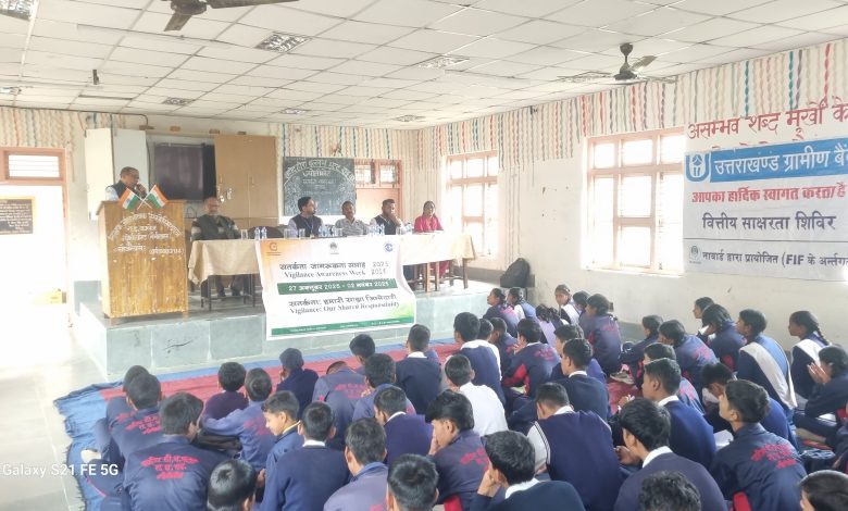 नैनीताल l सतर्कता जागरूकता सप्ताह का प्रारंभ देश भर में भ्रष्टाचार विरोधी मुहिम चलाते हुए 27 अक्टूबर 2025 से 2 नवंबर 2025 तक देश भर में सभी सरकारी गैर सरकारी कार्यालय में विजिलेंस अवेयरनेस वीक मनाया जा रहा है। गौरततलब है कि यह आयोजन लोह पुरुष सरदार वल्लभ भाई पटेल के जन्मदिन 31 अक्टूबर के मध्य आने वाले सप्ताह के अंदर मनाया जाता है। इस वर्ष का ध्येय वाक्य है सतर्कता: सबकी साझा जिम्मेदारी। नाबार्ड द्वारा चेष्टा विकास संस्था के सहयोग से राजकीय इंटर कॉलेज ज्योलीकोट में सतर्कता जागरूकता के संबंध में गोष्ठी आयोजित की गई। सभा में उपस्थित विद्यार्थियों के मध्य निवारक जागरूकता के संबंध में क्विज प्रतियोगिता का भी आयोजन कर विजई विद्यार्थियों को पुरस्कार प्रदान किये गये। उक्त गोष्ठी को चेष्टा संस्था की प्रमुख सुमन अधिकारी, नाबार्ड के जिला विकास प्रबंधक मुकेश बेलवाल, प्रिंसिपल के एस गोदियाल, मुकुल कुमार ने भी संबोधित किया। उत्तराखंड ग्रामीण बैंक के वित्तीय जागरूकता सलाहकार बी डी नैनवाल द्वारा भ्रष्टाचार निवारण एवं भ्रष्टाचार मुक्त भारत की परिकल्पना के संबंध में महान विचारकों के संदेशों को बताते हुए विद्यार्थियों को जागरूक किया गया। सभा में ग्राम प्रधान ज्योलीकोट नवल कुमार भी उपस्थित रहे, इसके साथ-साथ विद्यालय के अध्यापक एवं अन्य स्टाफ सहित अनेक मौजूद रहे।